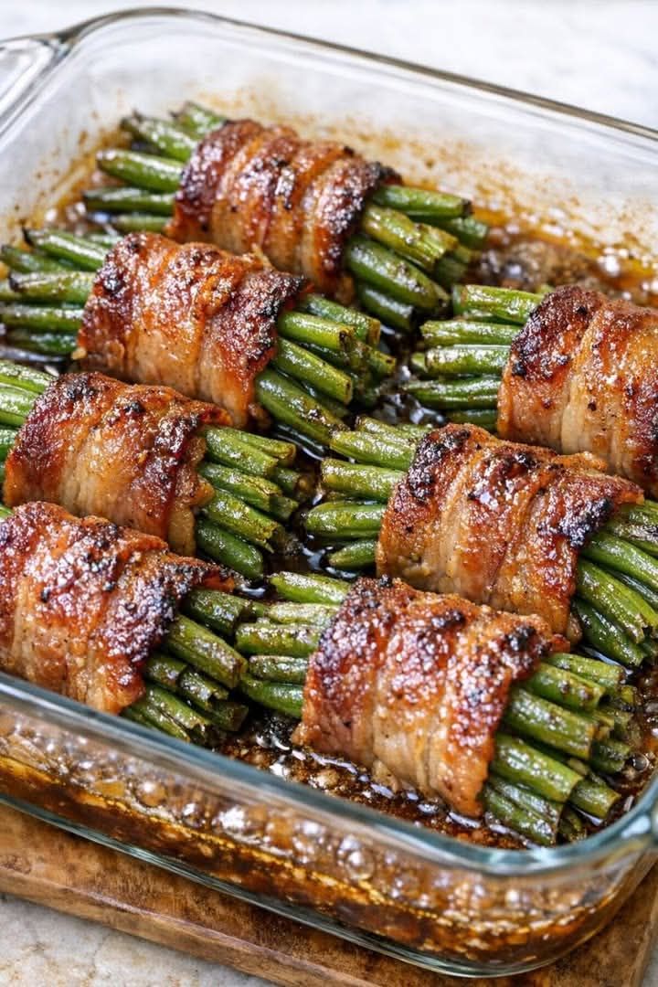 These southern 4-ingredient green bean bundles are exactly the kind of thing my mom would pull out for Easter dinner—simple, a little retro, and absolutely impossible to stop eating. Tender green beans are wrapped in salty bacon and baked in a buttery brown sugar glaze until the edges are caramelized and crisp. This style of dish has been floating around Southern church cookbooks and potlucks for years, and it’s one of those recipes where the serving dish is always scraped clean. It’s perfect for holidays or any time you want a side that feels special without asking for a ton of time or ingredients.